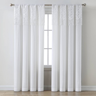 I bought this material at Joann (Earth Child Apparel Lace Panel Fabric With Fringe White). It’s not macrame but looks similar enough. If you can't find a fabric like it, you can use any cotton lace trims, just combine them. Make them the vertical width or length you want and make sure the last piece is the one with a fringe. It really does add a nice touch to otherwise plain cotton/linen curtains.